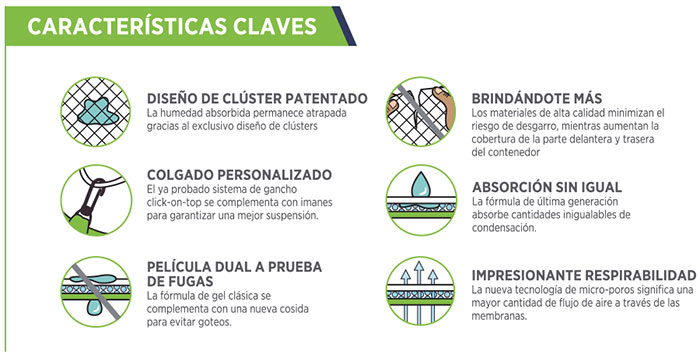 La clave para la suprema protección que ofrece VDRY BAGS, es que combina lo último en tecnología de membrana respirable con una fórmula de gel de alto rendimiento. Además, su instalación es simple y rápida gracias al diseño innovador de su sistema de colgado.